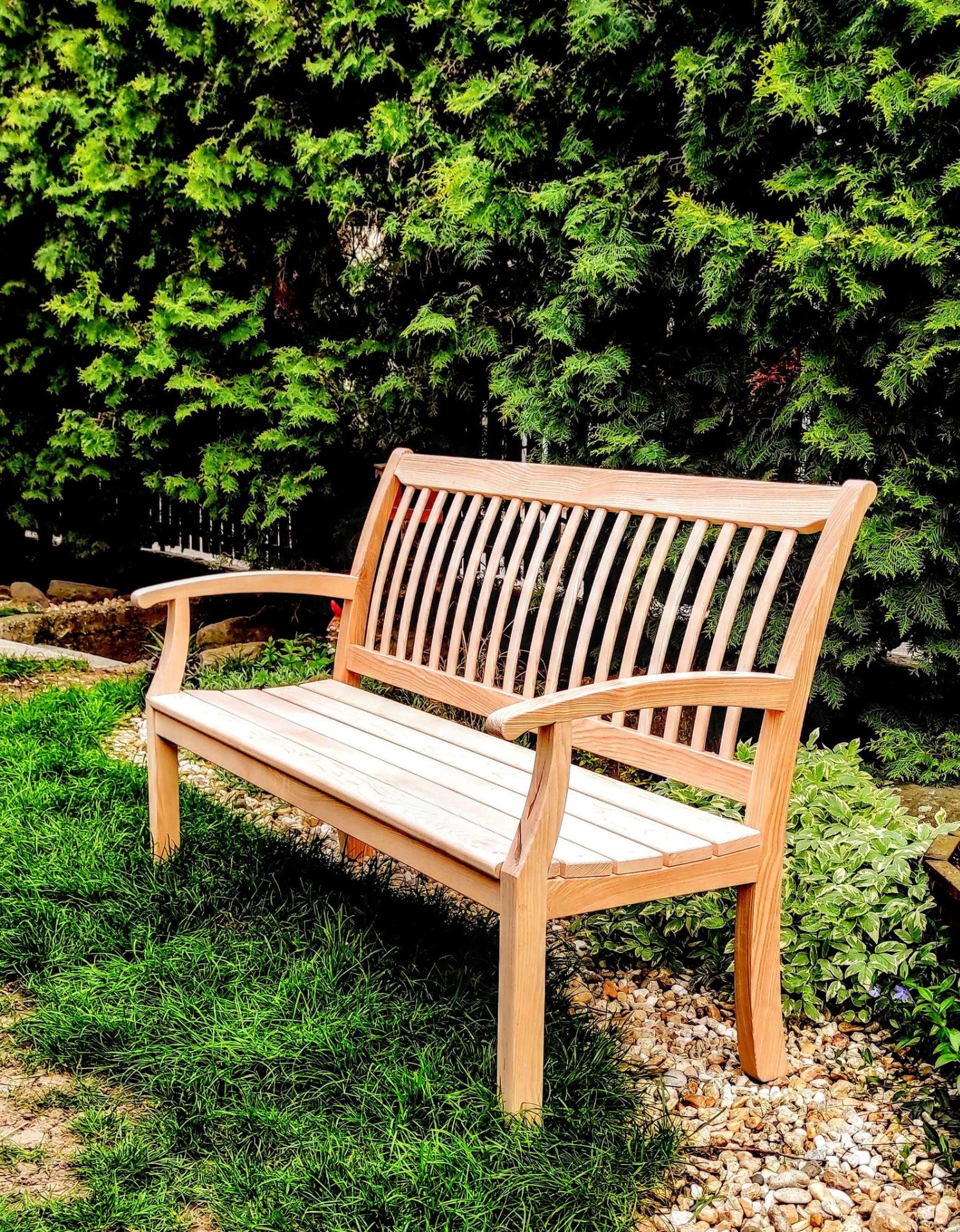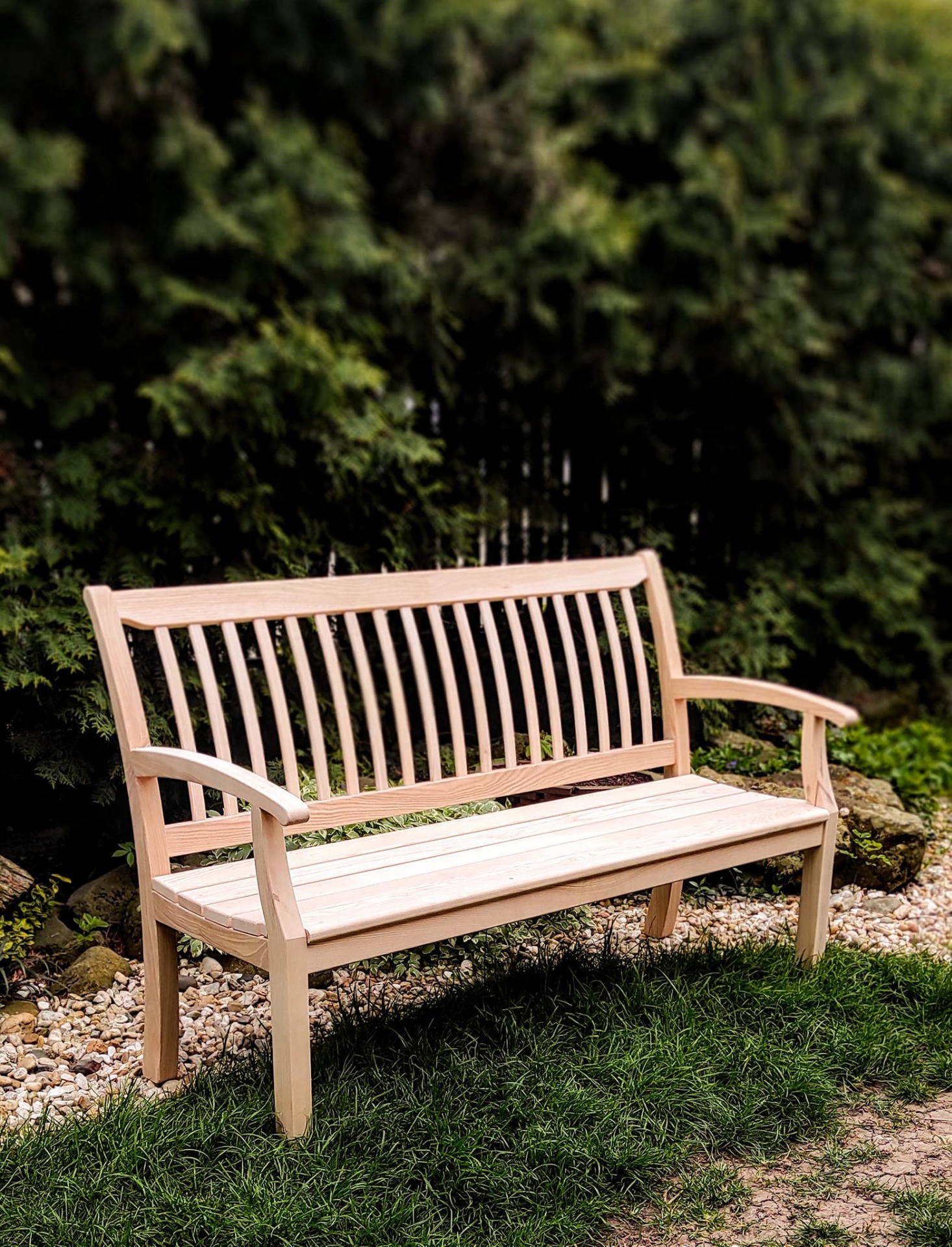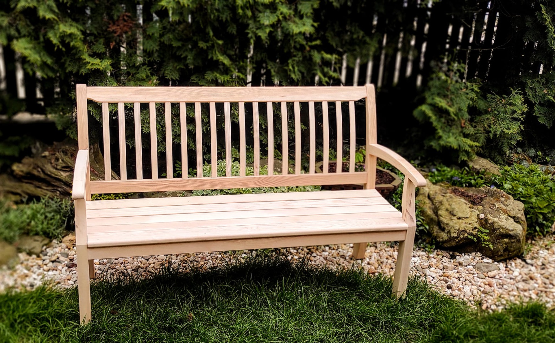Výsledkom je lavička, ktorá spája klasickú pevnosť a praktickosť s originálnym dizajnom. Jemne zakrivené operadlo, pohodlné opierky a čisté línie vytvárajú nábytok, ktorý pôsobí elegantne, no zároveň prirodzene zapadne do záhrady, na terasu či k domu.