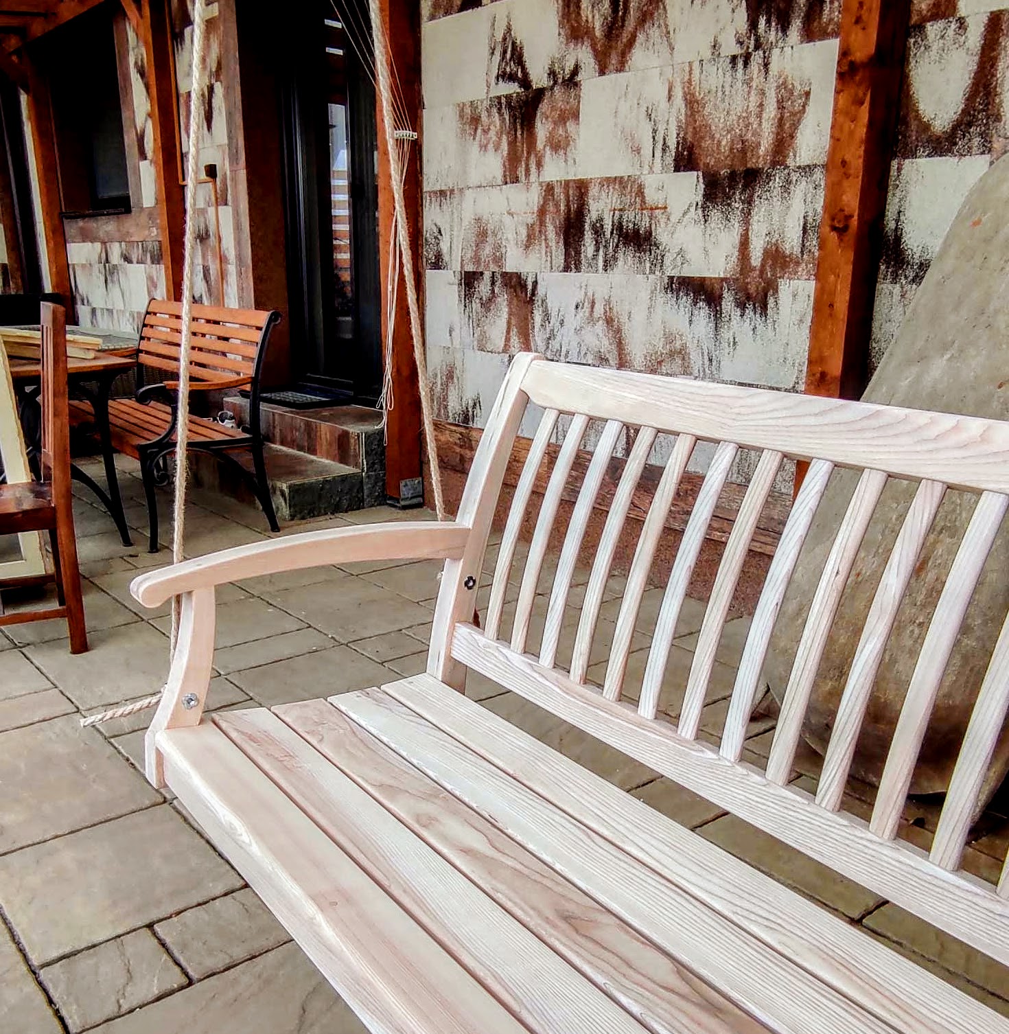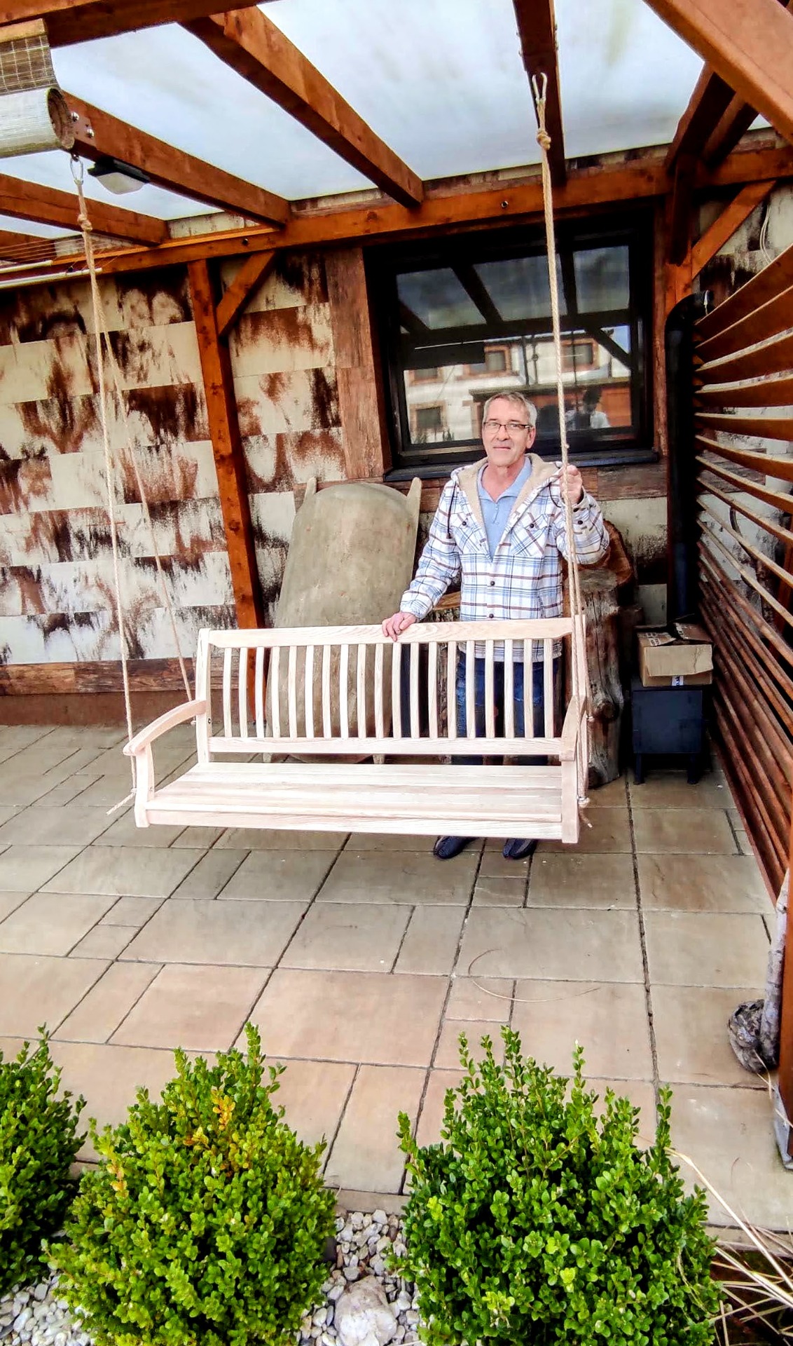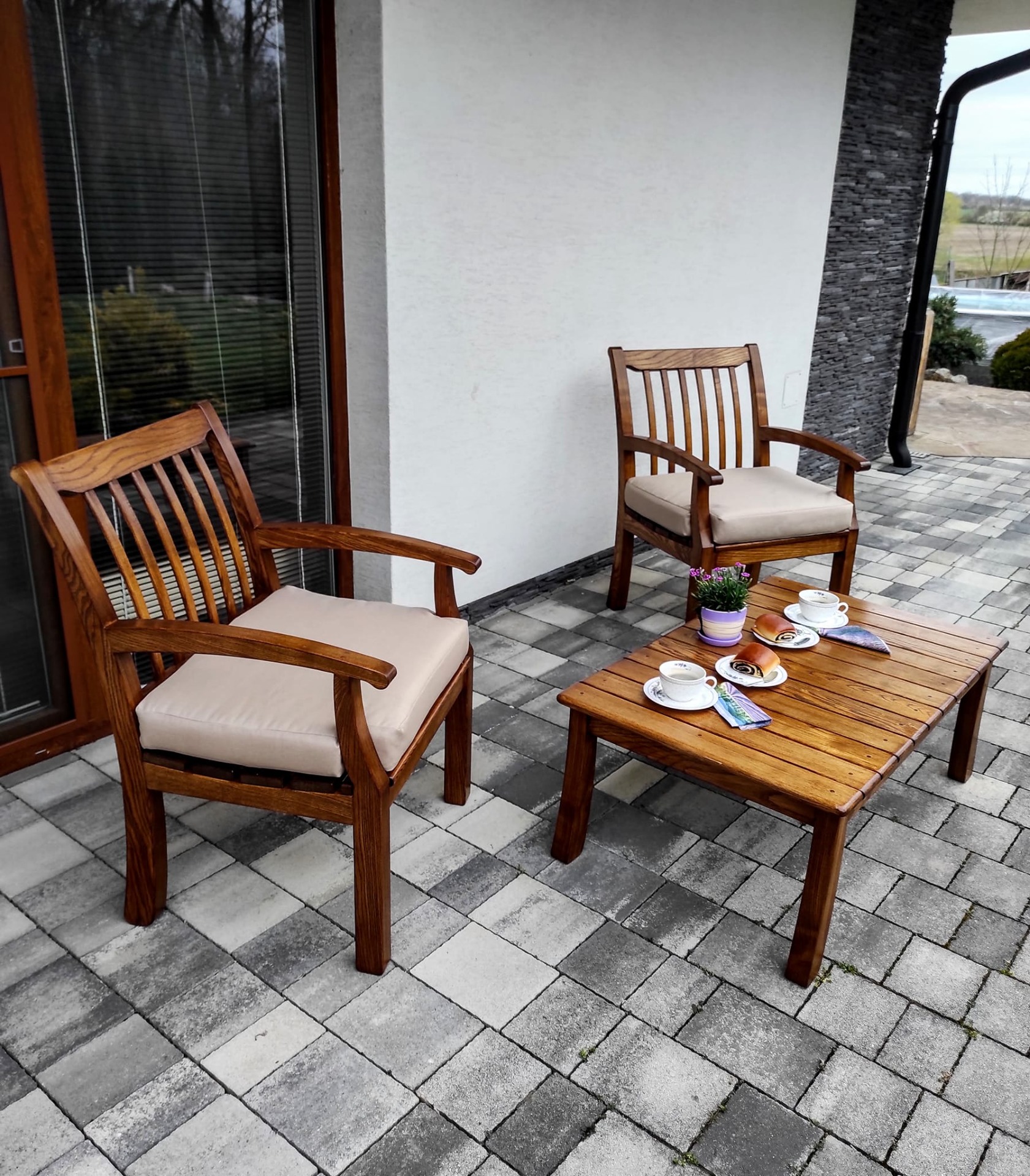 Výsledkom je lavička, ktorá spája klasickú pevnosť a praktickosť s originálnym dizajnom. Jemne zakrivené operadlo, pohodlné opierky a čisté línie vytvárajú nábytok, ktorý pôsobí elegantne, no zároveň prirodzene zapadne do záhrady, na terasu či k domu.