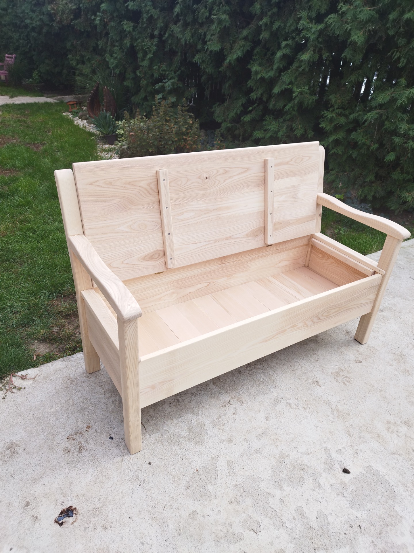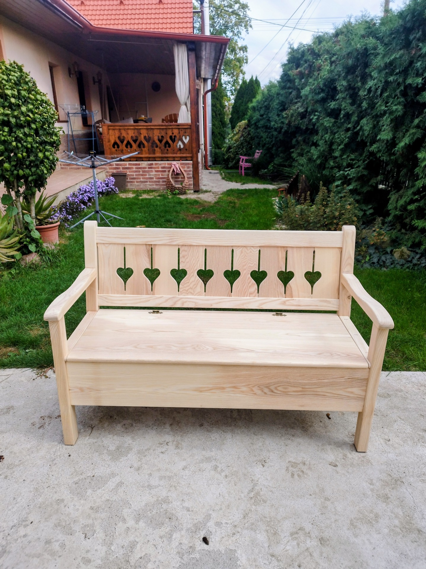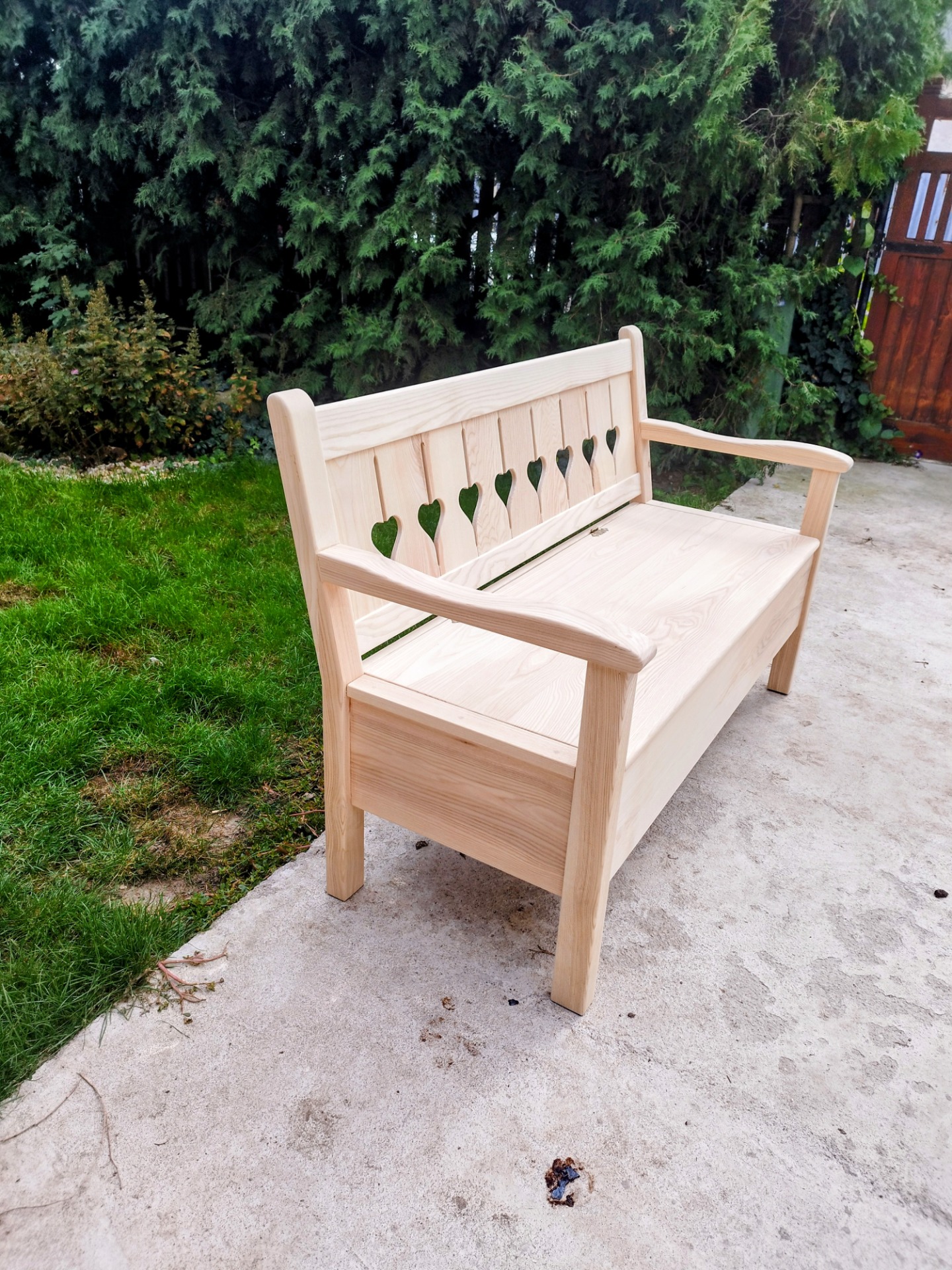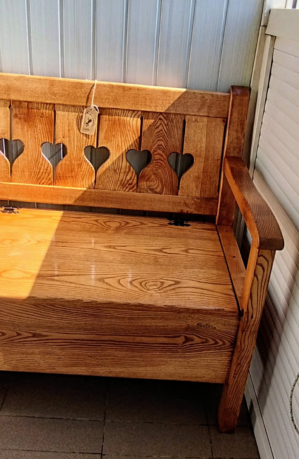 Originálna lavička z masívneho jaseňového dreva, ktorá spája krásu a praktickosť.Jej čelá zdobia vyrezávané srdiečka, ktoré jej dodávajú jemný ľudový nádych a útulný vzhľad.